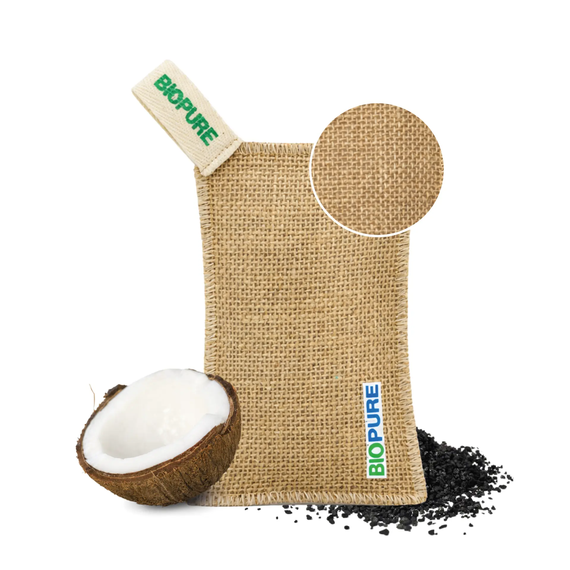 Bags made 100% of natural jute, filled with activated coconut charcoal as the main and pure ingredient for odor absorption.