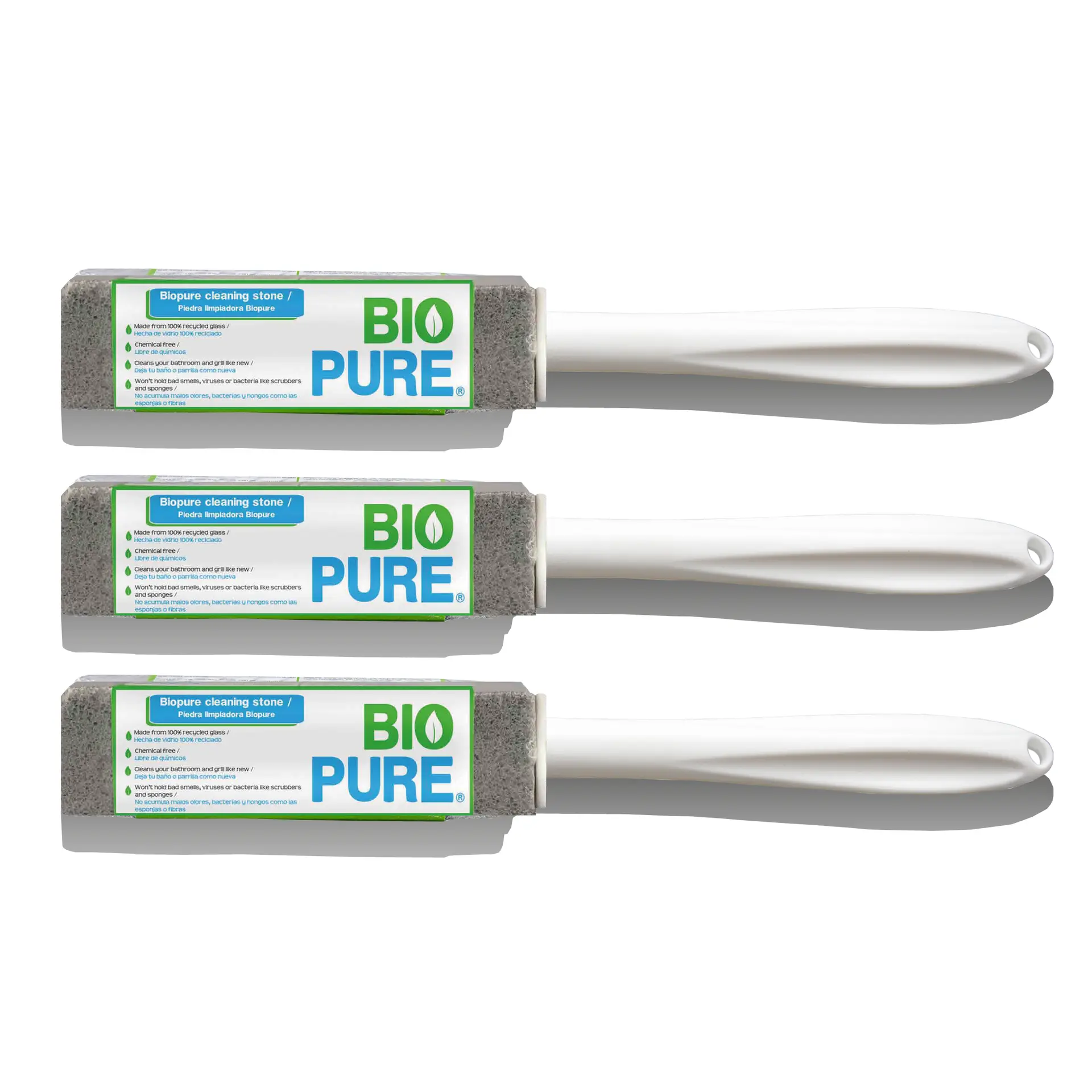 Grill blocks and abrasive blocks made from recycled glass, designed to clean surfaces resistant to high temperatures.