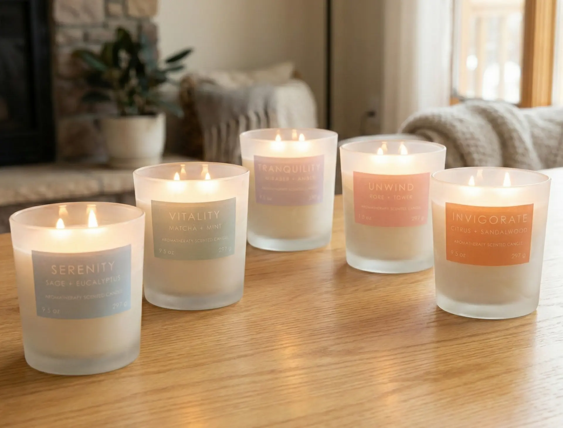 Sandalwood + Citrus, Matcha + Mint, Lavender + Amber, Eucalyptus + Sage, Rose + Tonka.